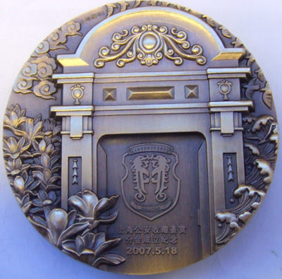 铜章的背面是最具上海地域特征的石库门图案,精雕细刻的工艺重现了上海开埠之初的民居风采,使人忆起三十年代十里洋场旧上海的景象。如今石库门大开,喻示着改革开放的春风吹遍了上海千家万户;喻示着上海人民海纳百川的博大胸怀。门中央镌刻铜章主题会标和主题文字。门框上端有祥云萦绕,和平鸽自由翱翔;门框左端是上海市花白玉兰昂首怒放;右端则是浪花滔滔,既象征着上海人民顺应历史潮流滚滚向前,也显示出上海地处东海之滨,长江之口那得天独厚的地理位置和通向世界的国际海港。综观整个铜章。从设计内涵,雕刻功力,到工艺制作都堪称上海造币厂本年度的精品佳作。