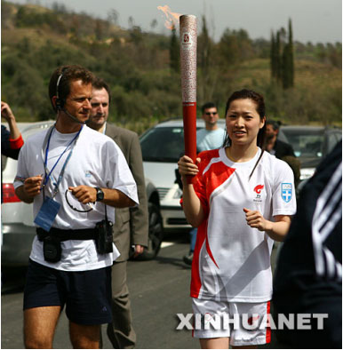 尼古拉泽斯手持火炬慢跑穿过整个古奥林匹克竞技场,向现代奥林匹克之父顾拜旦墓地的方向跑去。在那里,中国的游泳奥运冠军罗雪娟用尼克拉泽斯的火炬引燃了自己手中的火炬,她也成为北京奥运圣火传递的中国第一人。奥运火炬希腊境内传递活动自此正式拉开帷幕。 在随后的6天里,圣火将在希腊境内传递。3月30日下午,圣火将抵达位于雅典市中心的1896年首届现代奥运会会场。希腊奥委会将在那里举行圣火交接仪式,将圣火传递给北京奥组委。 3月31日圣火抵达北京。从4月1日起将在五大洲开展以“和谐之旅”为主题的奥运火炬接力。8月6日,奥运火炬返抵北京,8月8日晚点燃国家体育场(“鸟巢”)北京奥运会主火炬。 随着圣火传递活动的开始,北京奥运会的脚步越来越近。人们有充分的理由期待,在中国和世界各国人民的共同努力下,北京将向世人奉献一届“有特色、高水平”的奥运会。(新华网)
