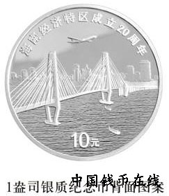 1盎司银质纪念币背面图案为海口市世纪大桥和建筑群及民航飞机组合设计,并刊“海南经济特区成立20周年”中文字样及面额。