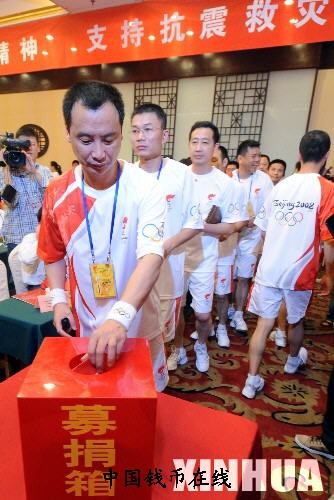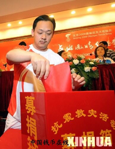5月16日,一位奥运火炬手为四川地震灾区捐款。当日,即将参加北京奥运圣火温州传递活动的奥运火炬手们为四川地震灾区捐款。