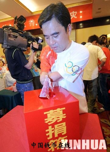 5月16日,奥运火炬手占旭刚为四川地震灾区捐款。当日,即将参加北京奥运圣火温州传递活动的奥运火炬手们为四川地震灾区捐款。     新华社记者王定昶摄
