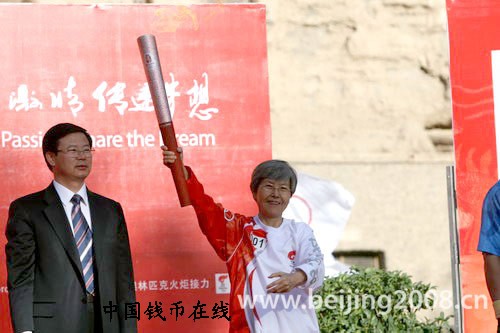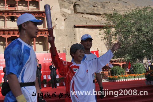奥运官方网站7月5日讯 今日8时12分,北京奥运会火炬接力敦煌站传递正式开始。敦煌研究院院长樊锦诗成为第一名火炬手,在莫高窟九层楼前广场,她举起祥云火炬,领跑“飞天故乡”敦煌的奥运火炬接力。