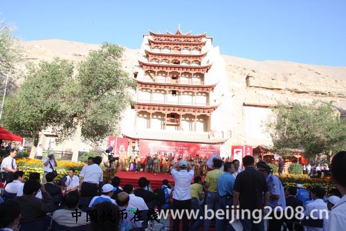 “敦,大也;煌,盛也。”盛大辉煌的敦煌有着悠久的历史,灿烂的文化!其境内有莫高窟、古阳关、玉门关、鸣沙山月牙泉、西千佛洞、寿昌城、汉代长城、悬泉置遗址、雅丹地貌等珍品景观20多处,莫高窟是敦煌文化艺术的杰出代表。莫高窟又名敦煌石窟,素有“东方艺术明珠”之称,是中国现存规模最大的石窟,保留了十个朝代、历经千年的洞窟492个,壁画45000多平方米,彩塑2000多座。题材多取自佛教故事,也有反映当时的民俗、耕织、狩猎、婚丧、节日欢乐等的壁画。这些壁画彩塑技艺精湛无双,被公认为是“人类文明的曙光”、世界佛教艺术的宝库。(奥运官方网站火炬接力前方报道记者 缪礼东 文并摄 www.beijing2008.cn)