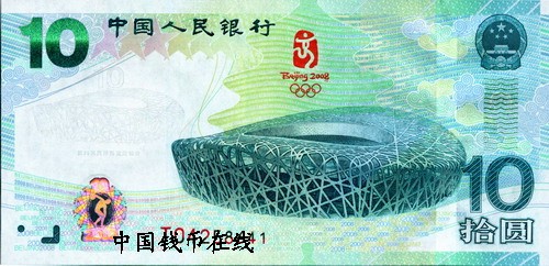 该纪念钞正面主景图案为北京2008年奥林匹克运动会主会场——国家体育场,其上方为第29届奥林匹克运动会会徽图案,背景为天坛图案。票面左上角为光彩光变面额数字“10”,其下方为国家体育场水印图案;票面左下方为盲文面额标记,全息定位镂空标识,双色接线异型号码;票面右侧自上而下分别为中华人民共和国国徽图案,凹印手感线,面额数字“10”与“拾圆”字样。
