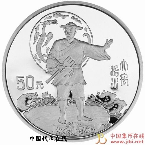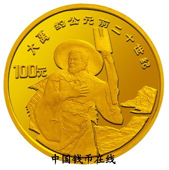 禹是中国原始部落联盟的首领,他一声最重要的功绩就是治水,禹有神和人的共性,极富传奇色彩,他有父无母,体现了父系氏族代替母系氏族的社会变革,禹花了十三年的功夫,采用疏导的办法,将黄河流域的洪水导向大海。禹治水认真负责,十分辛苦,三过家门而不入,赢得舜帝和百姓的信任。舜帝年老时,将首领的位置禅让给了禹。为纪念大禹治水的丰功伟绩,中国人民银行发行了大禹纪念金银币,世界名人和黄河文化纪念金银币中,都有大禹的形象,他手执他手握木锸,身披蓑衣,专注治水。
