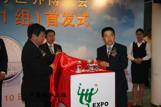 上海市常务副市长杨雄与中国人民银行副行长马德伦共同为中国2010年上海世界博览会金银纪念币(第1组)揭幕