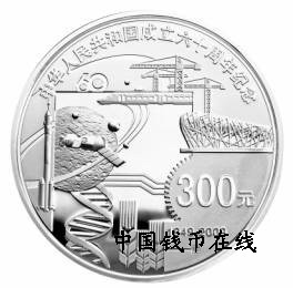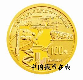 1公斤圆形金质纪念币、1/4盎司圆形金质纪念币、1公斤圆形银质纪念币背面图案相同,均为火箭、卫星、高速列车、奥运场馆、吊塔、齿轮、麦穗及DNA链、电子信息符号等装饰造型,并刊“中华人民共和国成立六十周年纪念”、“1949-2009”字样及面额。