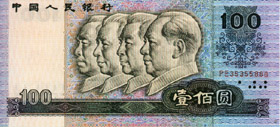 发行第四套人民币采取“一次公布,分次发行”的办法。这套人民币体现了一个共同的主题思想,就是在中国共产党的领导下,全国各族人民意气风发,团结一致,建设有中国特色的社会主义。为了强调这一主题,100元券采用了我党老一辈革命家毛泽东、周恩来、刘少奇和朱德的侧面浮雕像;50元券采用了工人、农民和知识分子人物头像;其它券别采用了我国14个民族人物头像。主币背面图景取材于我国名胜古迹、名山大川,它们分别是井冈山主峰、黄河壶口、珠穆朗玛峰、长江巫峡、南海“南天一柱”和长城等。票面的纹饰全部采用富有我国民族特点的图案,如凤凰牡丹、仙鹤松树、绶带鸟翠竹、燕子桃花等。这些图景、纹饰与主景融为一体,表现出鲜明的民族风格。