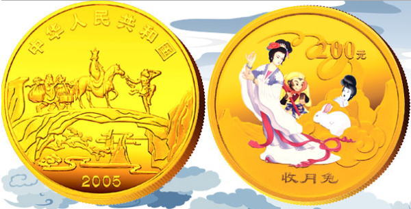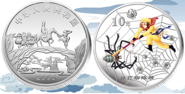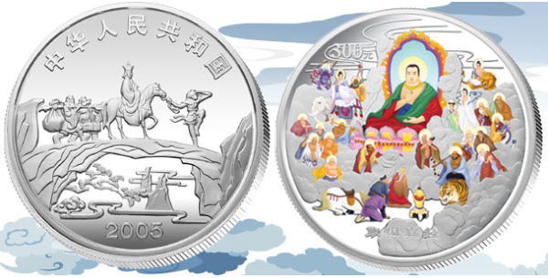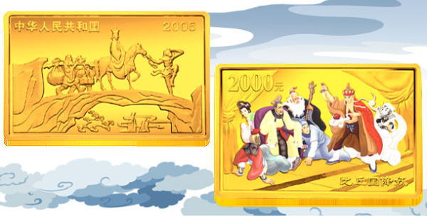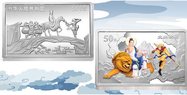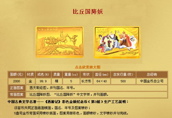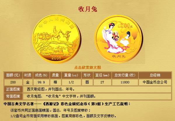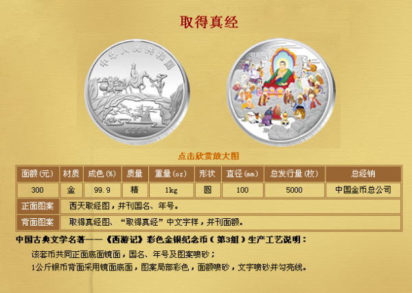 中国人民银行定于2005年9月15日发行中国古典文学名著----《西游记》彩色金银纪念币(第3组)一套。该套纪念币共6枚,其中金币2枚,银币4枚,均为中华人民共和国法定货币。 一、纪念币图案 (一)正面图案 该套彩色纪念币正面图案均为:西天取经图,并刊国名、年号。 (二)背面图案 1/2盎司彩色金质纪念币背面图案为:收月兔图、“收月兔”中文字样,并刊面额。 1盎司彩色银质纪念币(2枚)背面图案分别为:三调芭蕉扇图、“三调芭蕉扇”中文字样,并刊面额;棒打蜘蛛精图、“棒打蜘蛛精”字样,并刊面额。 5盎司彩色金质纪念币背面图案为:比丘国降妖图、“比丘国降妖”中文字样,并刊面额。 5盎司彩色银质纪念币背面图案为:文殊收狮图、“文殊收狮”中文字样,并刊面额。 1公斤彩色银质纪念币背面图案为:取得真经图、“取得真经”中文字样,并刊面额。 二、纪念币规格及发行量 (一)1/2盎司彩色金质纪念币为精制币,含纯金1/2盎司,成色99.9%,形状为圆形,直径27毫米,面额200元,发行量11800枚。 (二)1盎司彩色银质纪念币(2枚)为精制币,各含纯银1盎司,成色99.9%,形状为圆形,直径40毫米,面额10元,发行量各38000枚。 (三)5盎司彩色金质纪念币为精制币,含纯金5盎司,成色99.9%,形状为长方形,规格64毫米×40毫米,面额2000元,发行量500枚。 (四)5盎司彩色银质纪念币为精制币,含纯银5盎司,成色99.9%,形状为长方形,规格80毫米×50毫米,面额50元,发行量10000枚。 (五)1公斤彩色银质纪念币为精制币,含纯银1公斤,成色99.9%,形状为圆形,直径100毫米,面额300元,发行量5000枚。 三、该套纪念币由深圳国宝造币有限公司、沈阳造币厂铸造,中国金币总公司总经销 |