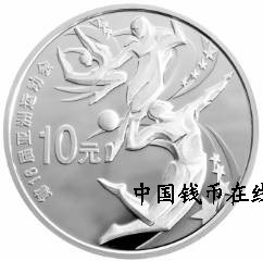 1盎司圆形银质纪念币背面图案为排球、足球、体操运动员造型等装饰设计,并刊“第16届亚洲运动会”中文字样及面额。