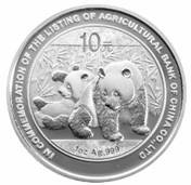1盎司圆形银质纪念币背面图案为双熊猫图,并刊“1oz Ag.999”字样、“中国农业银行股份有限公司上市纪念”英文字样及面额。