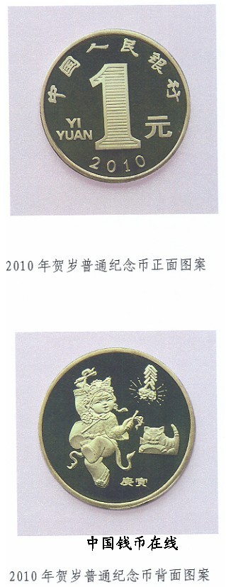 2010年贺岁普通纪念币面额为1元,直径为25毫米,材质为黄铜合金,发行数量3000万枚。