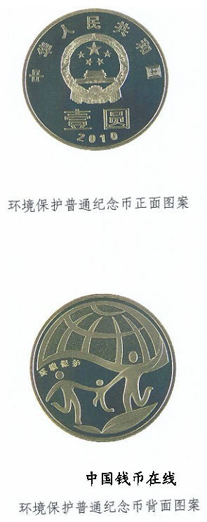 该普通纪念币正面图案为国徽,其上方刊“中华人民共和国”国名,下方刊“壹圆”面额和“2010”年号;背面主景图案为三个手拉手的人物形象,背景为图案化的地球和叶子,象征人类携手共同参与保护自然环境,内缘左侧刊“环境保护”字样。