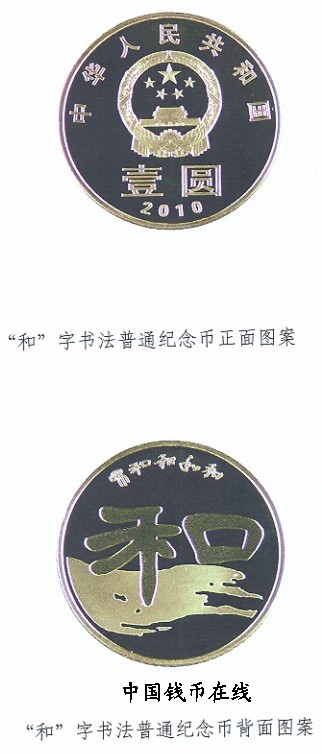 该普通纪念币正面图案为国徽,其上方刊“中华人民共和国”国名,下方刊“壹圆”面额和“2010”年号;背面主景图案为隶书“和”字,上方为多种字体书写的“和”字,背景以书法的飞白手法衬托。