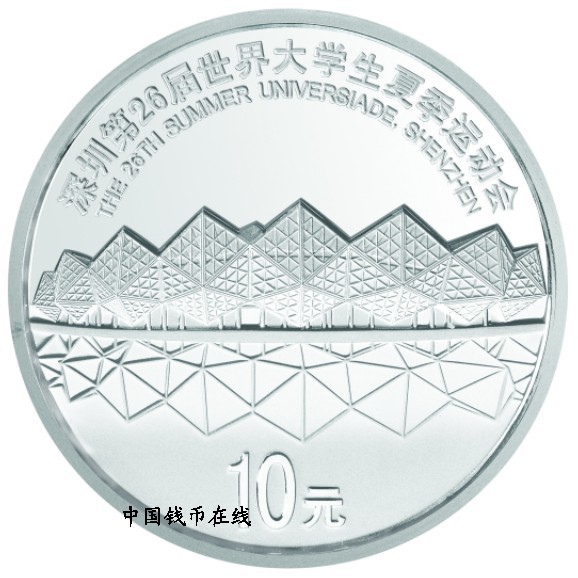 1盎司银质纪念币背面图案为深圳第26届世界大学生夏季运动会“大运中心”建筑造型及水中倒影装饰设计,并刊“深圳第26届世界大学生夏季运动会”中英文字样及面额。