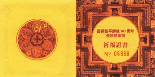 据了解,“西藏和平解放60周年”金银币(班禅开光加持版)的总发行量只有2000套(相当于总发行量的10%),纪念金币及纪念银币的号码段自06601起,至08600止(金银“鉴定证书”号码相同)。其中,绝大部分供西藏自治区的民众恭请,仅极少部分供全国各地的收藏爱好者。尤其非常幸运的是:第十一世班禅特意这2000套的“西藏和平解放60周年”金银币亲笔题字:“国泰民安 家庭幸福”作贺,在表达对我们国家、人民美好的祝愿的同时,更帮助收藏者增加福佑。