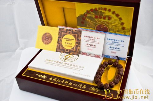 “西藏和平解放60周年”金银币(班禅开光加持版)配有班禅祈福证书一张,由班禅藏文手书“国泰民安,家庭幸福”,并签名;班禅加持证书一张,由班禅藏文手书“无数善相圣德成就之身,圆满云云众生所愿之语,觉悟一切法相实相之意,顶礼膜拜圣族之主释迦”,并签名。此外,盒内还置有金刚菩提手珠一串,金刚菩提子是金刚树所结之子,也有说是菩提树所结之子,甚为名贵,金刚菩提子产于印度释迦佛成道的地区,长期佩戴可增强人的意志和勇气,抵抗外邪,帮助收藏者成就事业和幸福。