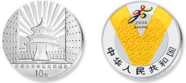 该银币含纯银1盎司,形状为圆形,直径40毫米,面额10元,成色为99.9%,质量精制,发行量为6万枚。正面图案为国名、年号、彩色申奥标志、镀金“V”字、群众体操造型。申办会徽由奥运五环色构成,形似中国传统民间工艺品的“中国结”,又似一个打太极拳的人形。图案如行云流水,和谐生动,充满运动感,象征世界人民团结、协作、交流、发展,携手共创新世纪;表达奥林匹克更快、更高、更强的体育精神。申办会徽正下方为“2008”及“BEIJING”字样,寓意北京申奥成功。背面图案为天坛祈年殿及敞开的宫门,面额以及“庆祝北京申奥成功纪念”中文字样。