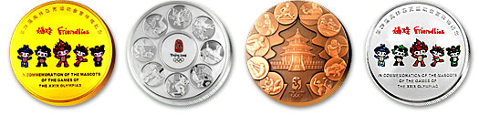 2005年11月12日,在北京奥运吉祥物公布的第二天,中国金币总公司发行了“第29届奥林匹克运动会吉祥物纪念章”。该套纪念章共分为7个规格,包括6枚金章(含1套5枚金章)、1套5枚金质胸章、7枚银章(含1套5枚银章)和7枚铜章(含1套5枚铜章)。纪念章正面图案均为第29届奥林匹克运动会吉祥物标准图案、并刊“第29届奥林匹克运动会吉祥物纪念”中文或中英文字样;背面图案(胸章背面无图案)分别为北京2008年奥运会会徽及体育项目组合图案和民间儿童运动图案。纪念章为北京2008年奥运会特许商品,均配有中国金币总公司鉴定证书和奥运特许商品防伪标签,是一套限量发行的收藏珍品。 目前市场看好,价格也一路走高,收藏和投资价值逐渐显现。