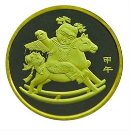 该普通纪念币正面刊“中国人民银行”、“1元”、汉语拼音字母“YIYUAN”及年号“2014”;背面图案为一个手持寓意“吉庆有余”挂件的小女孩骑在木马上,其右方刊“甲午”字样。