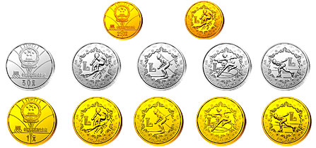1980年第13届冬季奥林匹克运动会金、银、铜纪念币。这是新中国首套奥运会题材纪念币;也是首套图案与直径相同,并分为两种重量的纪念币;又是首次在发行贵金属纪念币的同时,发行铜质纪念币。这套纪念币金质2枚、银质8枚、铜质8枚。