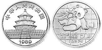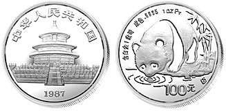1987年中国首枚熊猫1盎司铂币发行。使中国贵金属纪念币的化学元素材料又增加了新的成员。1988年中国第1枚错币诞生。第15届冬奥会27克滑雪银币文字错写为“16”届。 同年,12盎司 生肖精制银币获得世界银币大奖赛“最佳银币奖”。此币由上海造币厂曾成沪设计雕刻。 1989年中国首枚熊猫1盎司钯币发行至此,中国贵金属纪念币共有4种金属材料问世,即金 (Au)、银(Ag)、铂(Pt)、钯(Pd)。