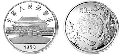 同年,直径23毫米熊猫币首次采用双金属工艺。1993年20盎司孔雀开屏精制银币获得世界硬币大奖赛“最佳银币奖”。此币由上海造币厂白文均、曾成沪设计雕刻。 同年,梅花型外边首次应用于生肖鸡年金银币。中国金币的首次知识产权法律纠纷,也由93生肖鸡年的5盎司金银纪念币引发。原由是中国金币总公司在生肖鸡年5盎司金银纪念币背面图案中未经同意采用了白铭的国画作品, 最终,以法院庭外调解结束这场官司。1994年中国近代名画系列金银币首创12边外型。1995年反喷砂工艺首次应用在熊猫普制金银币背面图案上。1996年长江三峡金银币首创长方形外边造型。