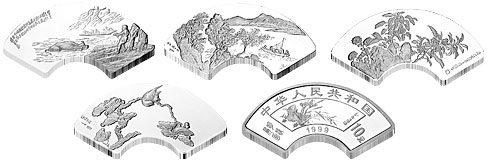 1998年中华人民共和国和加拿大联合发行“白求恩大夫到达中国60周年”纪念银币。 同年,首次在中国贵金属纪念币上采用中孔铸造工艺的“大唐镇库”金银币问世。北京国际钱币博览会1盎司熊猫加字银币背面图案首创局部镀金工艺。 首套生肖彩色金银纪念币的发行。 1999年扇型贵金属纪念币“明清扇画”发行。