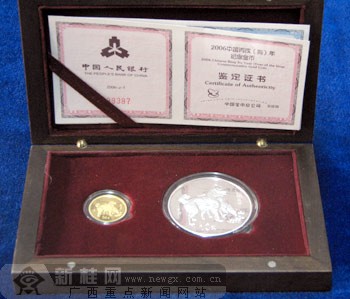 记者今天在广西钱币学会活动园地看到了狗年纪念彩色银条(见上图)。据悉,这是我国第一款农历丙戌狗年彩色银条,由沈阳造币厂铸造,由北京宝泉投资有限公司总经销。纪念银条正面图案为生肖狗与松梅迎春图案、狗年吉祥文字、2006与农历“丙戌”纪念;背面图案为“迎春纳福”文字、银质量标记。借喻戌岁兆丰百事顺,狗年祝福百时宁。纪念银条长92毫米、宽26毫米,成色99.999%,含纯银50克,采用浮雕与彩印相结合的工艺技术制作。单根零售价为500元人民币,全球限量发行2万根。