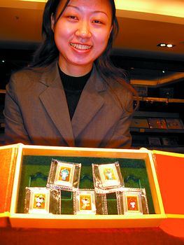工作人员正在展示50克装的福娃奥运金条。黄清安 摄