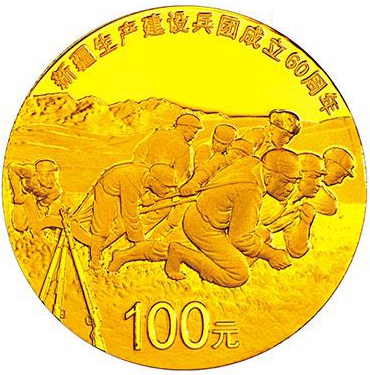 7.776克(1/4盎司)圆形金质纪念币背面图案为兵团战士坚苦创业,屯垦戍边场景,并刊“新疆生产建设兵团成立60周年”中文字样及面额。