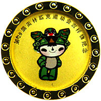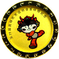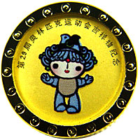 经北京奥组委授权,中国金币总公司发行的第29届奥林匹克运动会吉祥物纪念章,由深圳国宝造币有限公司与上海造币厂铸造。这套纪念章共7个规格,包括1公斤彩色金章1枚、1/10盎司彩色金章5枚、1公斤彩色银章1枚、1盎司彩色银章6枚;80毫米铜章1枚、38毫米彩色镀银铜章6枚,和1克彩色金质胸章5枚。彩色金质胸章是其中的另类,由于佩戴要求,它不仅另有附件,而且背面没有北京2008年奥运会会徽及体育项目组合图案。彩色金质胸章重1克,圆形,直径14毫米,在这套纪念章中,它的分量最轻,规格最小,但也是最能为参与者接受的品种。