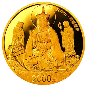 7.776克( 1/4盎司)圆形金质纪念币背面图案为“地藏菩萨”造像,衬以祥云纹饰组合设计,并刊“九华山·地藏菩萨”字样及面额。