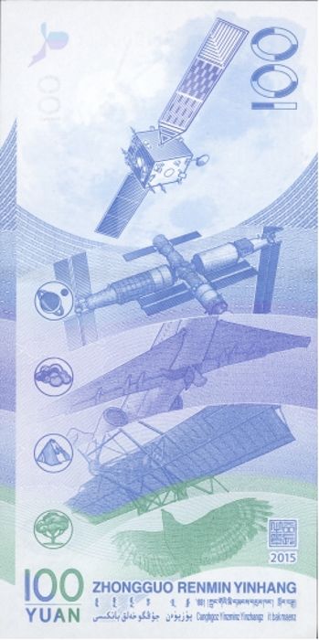 背面主景图案由上至下依次为嫦娥一号卫星图案、2020年中国空间站“天宫”、喷气式客机、冯如2号双翼螺旋桨飞机、飞禽海东青图案。票面左上角为风筝局部图案,右上角为面额数字“100”。票面下方为行长章与年号“2015”,中国人民银行汉语拼音字母和蒙、藏、维、壮四种民族文字的“中国人民银行”字样与面额,面额数字“100”,汉语拼音字母“YUAN”。