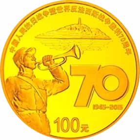 7.776克(1/4盎司)圆形金质纪念币背面图案为吹响抗战号角的八路军战士形象与延安宝塔山、延河水、数字“70”与时间“1945-2015”共同组成标志性符号的组合设计,并刊“中国人民抗日战争暨世界反法西斯战争胜利70周年”字样及面额。