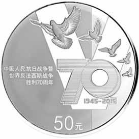 31.104克(1盎司)圆形银质纪念币背面图案为代表全民族抗战的人物群雕造型与长城、浪花、数字“70”与时间“1945-2015”共同组成标志性符号的组合设计,并刊“中国人民抗日战争暨世界反法西斯战争胜利70周年”字样及面额。