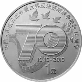背面图案为数字“70”与时间“1945-2015”共同组成的标志性符号,其上方为五只和平鸽由远及近展翅飞翔,衬景为以长城图案展现胜利的“V”字。内缘上方刊“中国人民抗日战争暨世界反法西斯战争胜利70周年”字样,右下方刊面额“1元”。