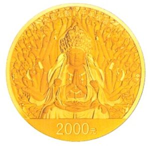 150克圆形金质纪念币背面图案为“千手观音”造像,并刊“大足石刻·千手观音”字样及面额。