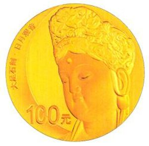 8克圆形金质纪念币背面图案为“日月观音”头部造像,并刊“大足石刻·日月观音”字样及面额。