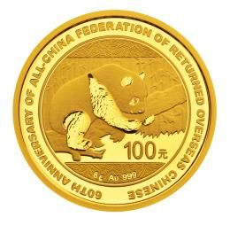 中国侨联成立60周年熊猫加字金银纪念币图案