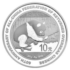 30克圆形银质纪念币背面图案为熊猫攀树图,并刊“30g Ag .999”字样、“中国侨联成立60周年纪念”英文字样及面额。