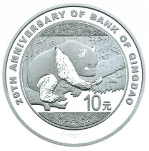 30克圆形银质纪念币背面图案为熊猫攀树图,并刊“30g  Ag .999”字样、“青岛银行成立20周年纪念”英文字样及面额。