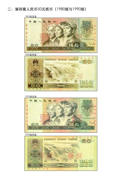 (二)第四套人民币50元纸币。其主色调为黑茶,正面图案为工人、农民、知识分子头像,背面图案为黄河壶口。