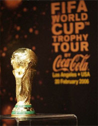 2006年德国世界杯足球赛将于6月9日至7月9日在德国举行。作为这次世界足球盛会前期宣传推广活动之一的“FIFA世界杯环球之旅”中国行活动于近期正式展开,象征着世界足球最高荣誉的“大力神杯”在北京大学隆重展出,中国球迷可以近距离欣赏“大力神杯”这一凝聚着无数辉煌时刻的金杯并与之合影。
