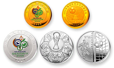 为纪念2006年德国世界杯足球赛的即将举行,中国人民银行于2005年1月18日发行2006年德国世界杯足球赛金银纪念币一套。该套纪念币共3枚,其中金质纪念币1枚,银质纪念币2枚,均为中华人民共和国法定货币。