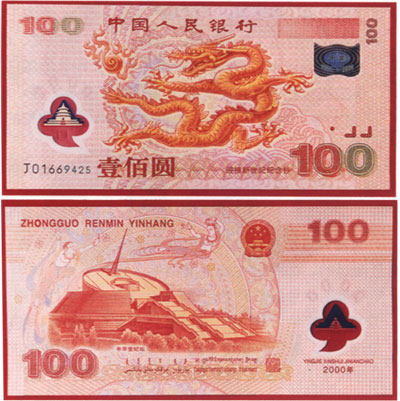 此壹佰圆纪念钞,票幅 165*80毫米,印刷载体为塑料基片,发行量1000万套。其主色调为橘黄色,正面图景以北京北海九龙壁左数第三条龙(升龙)为设计依据,“龙”的左侧为“火珠”吉祥图案,票面左下侧透明视窗为北京天坛祈年殿的涂层图案,右上侧动态全息标志图像为大红灯笼,上印“千年”字样,下方印有两个“2000”字样,右下方印“迎接新世纪纪念钞”及“100”字样。背面主景为迎接新世纪的代表性建筑——“中华世纪坛”的乾坤台及周围景色,台下方印有“中华世纪坛”字样,圆盘的指针为“时空指针”,敦煌的飞天图案展现在世纪坛上空,底纹有敦煌藻井图案,右下方为蒙、藏、维、壮四种少数民族文字的“中国人民银行”字样和面额,透明视窗下方印有“迎接新世纪钞”的汉语拼音及“2000年”字样。纪念钞与现行人民币具有相同职能,与同等面额人民币等值流通。
