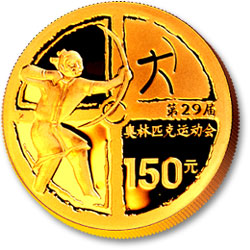 金币共同正面图案为中国传统对龙造型、第29届奥运会会徽和国名、年号。 金币的背面图案设计以体育运动为主题,主景是中国古代传统体育文化的体育造型动作,分别为马术体育造型和射箭体育造型,历史跨度自东汉、北周、隋代、元代到明代,约1600多年。与主景历史传统体育人物造型相对应的,是第29届奥运会体育项目图形。