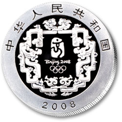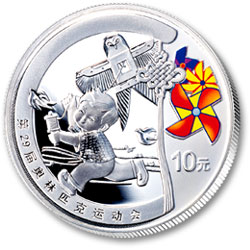 银币共同正面图案为中国传统对龙造型、第29届奥运会会徽和国名、年号。 银币背面图案以生动活泼、造型可爱、引人入胜的民间儿童体育游戏为内容,分别采用“放风筝”、“跳山羊”、“滚铁圈”、“踢毽子”四个典型的儿童体育游戏主景为币面主题,儿童游戏动作夸张有力,姿态优美,犹如朝阳蒸蒸日上,体现了奥林匹克精神永远向上、世代相传的深刻内涵。画面右侧1/3处用“中国结”来分割,右翼分别配置纸风车、泥塑兔儿爷、双鱼挂饰、布艺老虎等彩色玩具造型,活力四溢。