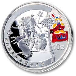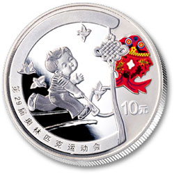 该枚币反映了儿童体育游戏——踢毽子。币面右侧1/3处用“中国结”分割,同时在右翼配置了彩色玩具造型——布老虎。 踢毽子是我国民间一项历史悠久的传统体育活动,出现于二千年前的汉代,兴起于南北朝及隋唐时期。毽子一般用动物羽毛制造,踢毽子用脚等身体部位触击毽子,集趣味性、普及性和简单性于一身。 银币的背面图案设计有4个特点:1、全套币面图案以中国传统民俗文化饰物“中国结”来分割币面构图;2、币面均为局部彩色印制民俗装饰图案;3、币面构图统一形式和风格,但又有规律性的左右变化;4、币面造型动态与静态相互间隔,有节奏感。整套银币画面轻快,造型活泼,加之缤纷的局部彩色工艺,使人耳目一新。