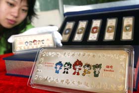 北京奥运银分别有40克、50克、100克、500克及1000克5种规格,均采用成色为99.9%的纯银制造,是目前惟一印有38个奥运吉祥物分项造型的银条。